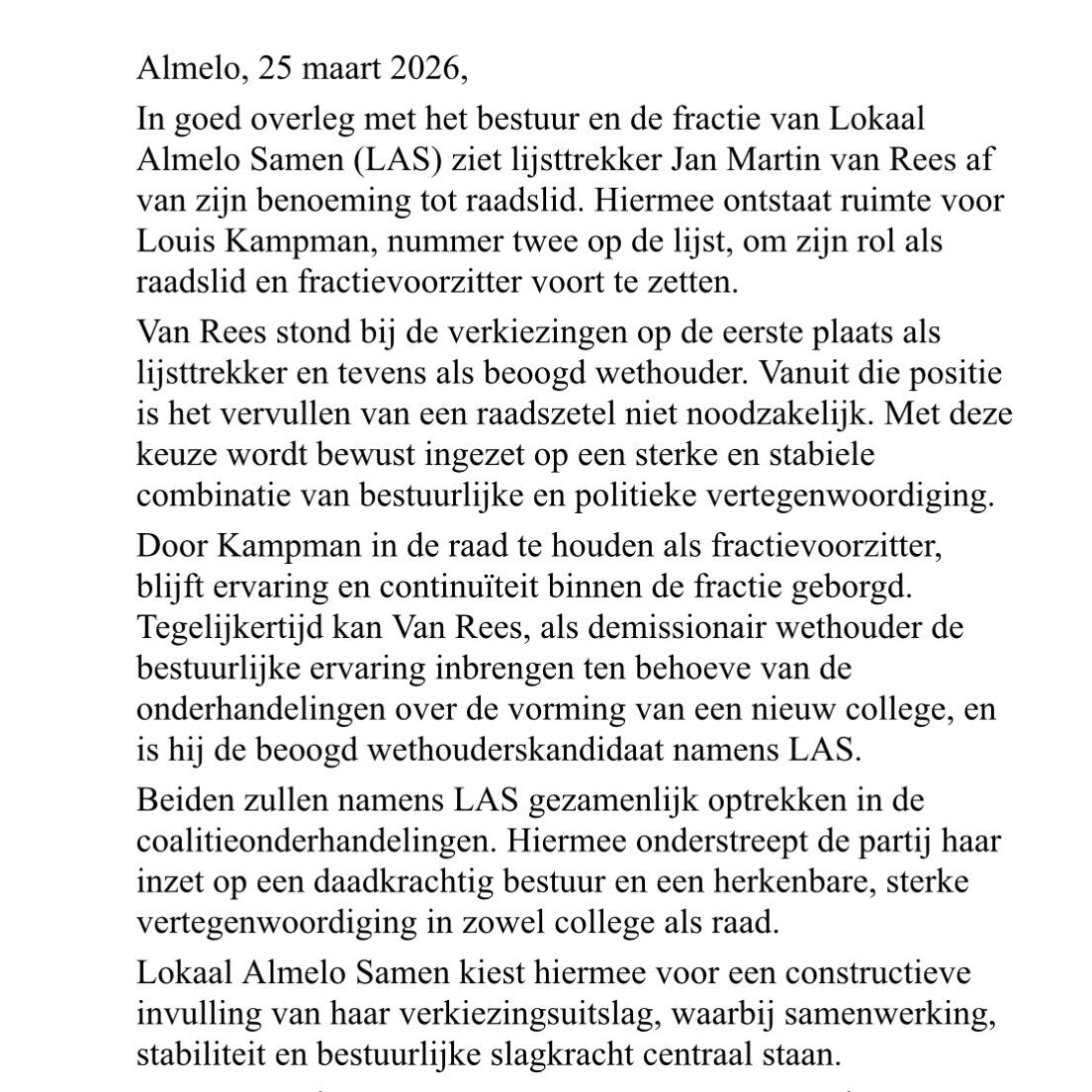 Jan Martin van Rees ziet af van raadszetel ten gunste van Louis Kampman…